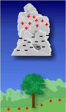 The electric field within the storm is not the only one that develops. Below the negatively charged storm base, positive charge begins to pool within the surface of the earth (see image left). This positive charge will shadow the storm wherever it goes, and is responsible for cloud-to-ground lightning. However, the electric field within the storm is