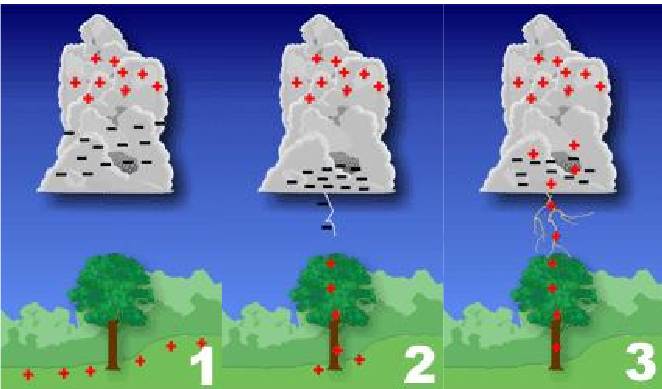 A moving thunderstorm gathers another pool of positively charged particles along the ground that travel with the storm (image 1). As the differences in charges continue to